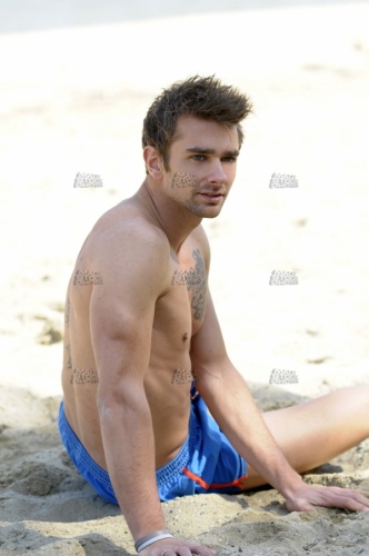 Model_1347, 20s, Pose, Posing, pose, poser, posa, posar, Sand, sable, arena, Badehose, badeanzug, swimwear, sim, wear, swimming, trunks, suit, maillot, bain, trusa, baño, Shorts, blau, blue, bleu, azúl, Oberkörper, nackt, shirtless, topless, torse, nu, busto, desnudo, Tätowierung, tattoo, tatouage, tatuaje, Gesichtsbehaarung, Bart, Schnauz, Schnauzer, drei, Tage, Bart, facial, hair, pilosité, faciale, moustache, barbe, barbouze, barba, bigote, Waschbrettbauch, six, pack, Sixpack, sickpacks, abdominals, abs, abdominaux, abdominales, Brust, Brustkorb, Brustmuskulatur, chest, pecs, pectoraux, pectorales, See, lake, lac, lago, Meer, sea, mer, mar, Wasser, water, eau, agua, aussen, draussen, outdoor, outside, exterior, external, extérieur, fuera, allein, alone, seul, solo, athlet, athlete, athlète, atleta, athletisch, athletic, athlétique, atlético, schlank, slim, slender, mince, delgado, Mann, man, male, mâle, homme, hombre, macho, erotik, eroticism, érotisme, charme, erotismo, erotisch, erotic, érotique, erótico, haut, skin, peau, piel, muskel, muscle, musculo, sinnlich, sensual, sensuel, kaukasisch, caucasian, caucasien, caucasiano,