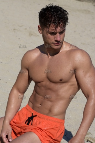 Model_1387, 20s, in, sich, gekehrt, introvertiert, contemplating, meditating, songeant, méditant, ensimismado, shorts, orange, badehose, badeanzug, swimwear, sim, wear, swimming, trunks, suit, maillot, bain, trusa, baño, wassertropfen, waterdrop, goutte, eau, gota, agua, nass, wet, mouillé, mojado, arm, bras, brazo, gesichtsbehaarung, bart, schnauz, schnauzer, drei, tage, bart, facial, hair, pilosité, faciale, moustache, barbe, barbouze, barba, bigote, ruhe, entspannung, rest, relaxation, repos, détente, descanso, relajamiento, oberkörper, nackt, shirtless, topless, torse, nu, busto, desnudo, kontrast, contrast, contraste, schatten, shadow, ombre, sombra, pose, posing, pose, poser, posa, posar, strand, beach, plage, playa, sand, sable, arena, Waschbrettbauch, six, pack, Sixpack, sickpacks, abdominals, abs, abdominaux, abdominales, brust, brustkorb, brustmuskulatur, chest, pecs, pectoraux, pectorales, allein, alone, seul, solo, athlet, athlete, athlète, atleta, athletisch, athletic, athlétique, atlético, mann, man, male, mâle, homme, hombre, macho, muskulös, muscular, musclé, musculoso, muskel, muscle, musculo, erotik, eroticism, érotisme, charme, erotismo, haut, skin, peau, piel, modell, model, modèle, modelo, kaukasisch, caucasian, caucasien, caucasiano, aussen, draussen, outdoor, outside, exterior, external, extérieur, fuera,