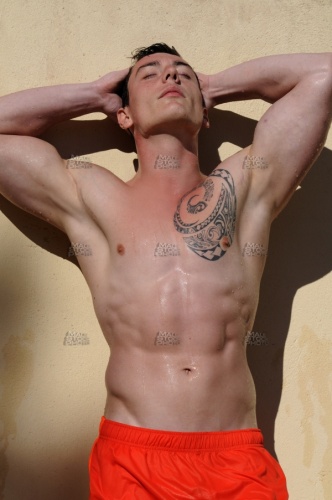 model_1376, 20s, sonnenbaden, sun, tanning, bask, lézarder, tomar, sol, nass, wet, mouillé, mojado, Wassertropfen, waterdrop, goutte, eau, gota, agua, Orange, naranja, Badehose, badeanzug, swimwear, sim, wear, swimming, trunks, suit, maillot, bain, trusa, baño, waschbrettbauch, six, pack, sixpack, sickpacks, abdominals, abs, abdominaux, abdominales, brust, brustkorb, brustmuskulatur, chest, pecs, pectoraux, pectorales, pose, posing, pose, poser, posa, posar, schatten, shadow, ombre, sombra, arm, bras, brazo, oberkörper, nackt, shirtless, topless, torse, nu, busto, desnudo, kontrast, contrast, contraste, arm, bras, brazo, mauer, wand, wall, mur, muraille, paroi, pared, muro, tätowierung, tattoo, tatouage, tatuaje, allein, alone, seul, solo, aussen, draussen, outdoor, outside, exterior, external, extérieur, fuera, athlet, athlete, athlète, atleta, athletisch, athletic, athlétique, atlético, mann, man, male, mâle, homme, hombre, macho, boy, guy, stud, hunk, dude, mec, chico, form, shape, forme, forma, haut, skin, peau, piel, körperlich, physical, corporelle, corporal, männlichkeit, masculinity, masculinité, virilité, masculinidad, virilidad, modell, model, modèle, modelo, muskel, muscle, musculo, muskulös, muscular, musclé, musculoso, sinnlichkeit, sensuality, sensualité, sensualidad, voluptuosidad, caucasian, caucasien, caucásico,