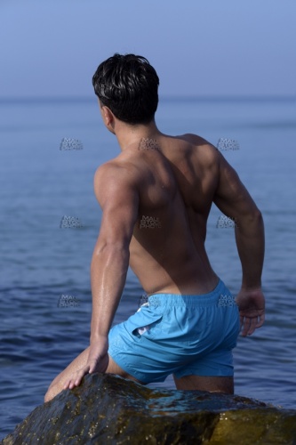 model_1408, 20s, Felsen, rock, rocher, roca, Arm, bras, brazo, Wassertropfen, waterdrop, goutte, eau, gota, agua, nass, wet, mouillé, mojado, Badehose, badeanzug, swimwear, sim, wear, swimming, trunks, suit, maillot, bain, trusa, baño, blau, blue, bleu, azúl, shorts, Rücken, back, dos, espalda, dorso, pose, posing, pose, poser, posa, posar, kontrast, contrast, contraste, schatten, shadow, ombre, sombra, wasser, water, eau, agua, meer, sea, mer, mar, sand, sable, arena, strand, beach, plage, playa, oberkörper, nackt, shirtless, topless, torse, nu, busto, desnudo, allein, alone, seul, solo, aussen, draussen, outdoor, outside, exterior, external, extérieur, fuera, athlet, athlete, athlète, atleta, athletisch, athletic, athlétique, atlético, bodybuilder, body, builder, muscleman, kraftsportler, muskelmann, culturiste, culturista, cachas, mann, man, male, mâle, homme, hombre, macho, boy, guy, stud, hunk, dude, mec, chico, form, shape, forme, forma, haut, skin, peau, piel, körperlich, physical, corporelle, corporal, männlichkeit, masculinity, masculinité, virilité, masculinidad, virilidad, modell, model, modèle, modelo, muskel, muscle, musculo, muskulös, muscular, musclé, musculoso, sinnlichkeit, sensuality, sensualité, sensualidad, voluptuosidad, caucasian, caucasien, caucásico,