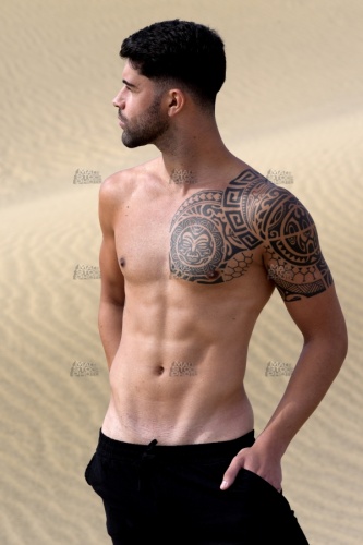 Model_1403, 20s, Profil, profile, perfil, Sand, sable, arena, Tätowierung, tattoo, tatouage, tatuaje, kontrast, contrast, contraste, schatten, shadow, ombre, sombra, blau, blue, bleu, azúl, Leinen, linen, lien, toile, lienzo, lino, hose, trousers, pantalons, pantalones, oberkörper, nackt, shirtless, topless, torse, nu, busto, desnudo, gesichtsbehaarung, bart, schnauz, schnauzer, drei, tage, bart, facial, hair, pilosité, faciale, moustache, barbe, barbouze, barba, bigote, Oberkörper, nackt, shirtless, topless, torse, nu, busto, desnudo, Brust, Brustkorb, Brustmuskulatur, chest, pecs, pectoraux, pectorales, Waschbrettbauch, six, pack, Sixpack, sickpacks, abdominals, abs, abdominaux, abdominales, aussen, draussen, outdoor, outside, exterior, external, extérieur, fuera, allein, alone, seul, solo, aussen, draussen, outdoor, outside, exterior, external, extérieur, fuera, athlet, athlete, athlète, atleta, athletisch, athletic, athlétique, atlético, mann, man, male, mâle, homme, hombre, macho, erotik, eroticism, érotisme, charme, erotismo, haut, skin, peau, piel, modell, model, modèle, modelo, pose, posing, pose, poser, posa, posar, sinnlichkeit, sensuality, sensualité, sensualidad, voluptuosidad, kaukasisch, caucasian, caucasien, caucasiano, mediteran, mediterranean, méditérranéen, mediteraneo,
