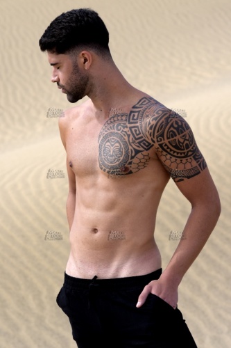 Model_1403, 20s, Profil, profile, perfil, Sand, sable, arena, Tätowierung, tattoo, tatouage, tatuaje, kontrast, contrast, contraste, schatten, shadow, ombre, sombra, blau, blue, bleu, azúl, Leinen, linen, lien, toile, lienzo, lino, hose, trousers, pantalons, pantalones, oberkörper, nackt, shirtless, topless, torse, nu, busto, desnudo, gesichtsbehaarung, bart, schnauz, schnauzer, drei, tage, bart, facial, hair, pilosité, faciale, moustache, barbe, barbouze, barba, bigote, Oberkörper, nackt, shirtless, topless, torse, nu, busto, desnudo, Brust, Brustkorb, Brustmuskulatur, chest, pecs, pectoraux, pectorales, Waschbrettbauch, six, pack, Sixpack, sickpacks, abdominals, abs, abdominaux, abdominales, aussen, draussen, outdoor, outside, exterior, external, extérieur, fuera, allein, alone, seul, solo, aussen, draussen, outdoor, outside, exterior, external, extérieur, fuera, athlet, athlete, athlète, atleta, athletisch, athletic, athlétique, atlético, mann, man, male, mâle, homme, hombre, macho, erotik, eroticism, érotisme, charme, erotismo, haut, skin, peau, piel, modell, model, modèle, modelo, pose, posing, pose, poser, posa, posar, sinnlichkeit, sensuality, sensualité, sensualidad, voluptuosidad, kaukasisch, caucasian, caucasien, caucasiano, mediteran, mediterranean, méditérranéen, mediteraneo,